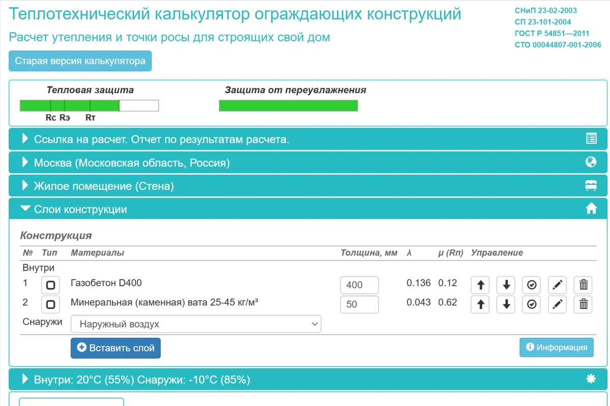 Программа сама сравнит этот показатель с требуемым по строительным нормам для конкретного региона. И если толщины конструкции будет