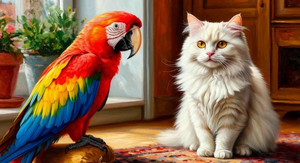 Другие истории ЗДЕСЬ Сегодня я расскажу вам историю, от которой даже наш хомяк Шпунтик прекратил на целых пять минут(!) грызть семечки. На дворе пахло Мартом. Нет, не человеком, а месяцем. Весной. А это значит, что Пушинка Обжоркина начала вести себя… ммм… странно. Она ходила по дому, томно мурлыкала и смотрела на меня своими жёлтыми глазами с поволокой. Ну, знаете, как в фильмах про вампиров. Только я — не вампир. Я — попугай. И вообще, она не в моём вкусе. Хозяйка, конечно, сразу всё поняла. Два дня вздыхала, а потом притащила… его. Кота. Брутального. С шикарной гривой, хвостом, как у павлина, и взглядом, который говорил: «Я — король, а вы все — мои подданные». Даже я, Кекс Великолепный, восхитился его высокомерным пренебрежением ко всему. Кроме еды. Еду он уважал. Кот вошёл в дом, как в свою вотчину. Обнюхал Пушинку, которая тут же замерла в позе «ой, кто это такой красивый?», а потом… БАМ! — стукнул её лапой по заднице. Прямо как в фильмах про ковбоев. Только Пушинка — не
