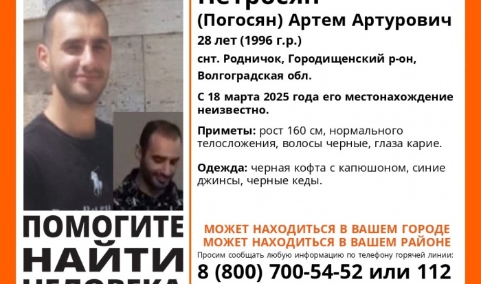 О местонахождении Артема Петросяна ничего не известно с 18 марта. В СНТ «Родничок» Городищенского района пропал без вести Артем Артурович Петросян (Погосян), 1996 года рождения. К розыску подключились волонтеры. На ресурсах поискового отряда «ЛизаАлерт» опубликованы приметы мужчины. Рост пропавшего составляет 160 см, у него нормальное телосложение, черные волосы и карие глаза. В день исчезновения мог быть одет в черную кофту с капюшоном и синие джинсы, на ногах – темные кеды. Если вы обладаете какими-либо сведениями о том, где сейчас может находиться Артем, просьба сообщить информацию организаторам поисков.