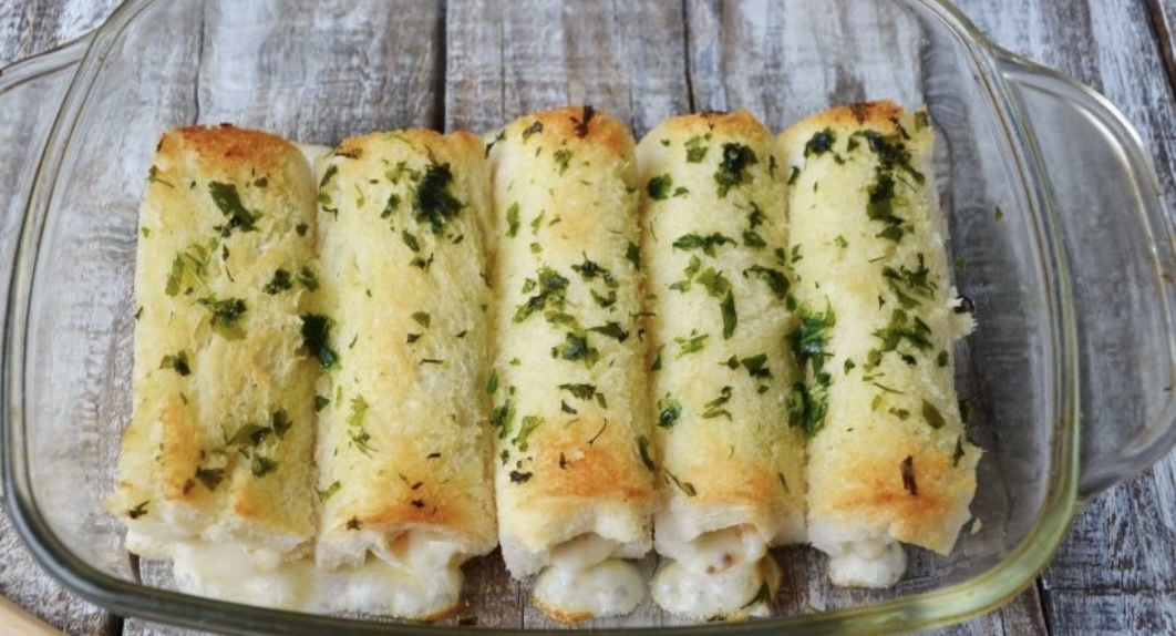 Запекайте в духовке минут 10-15 до образования красивой корочки. Температура — 200 градусов, этого достаточно, чтобы сыр внутри расплавился! Подавайте рулетики к столу горячими!