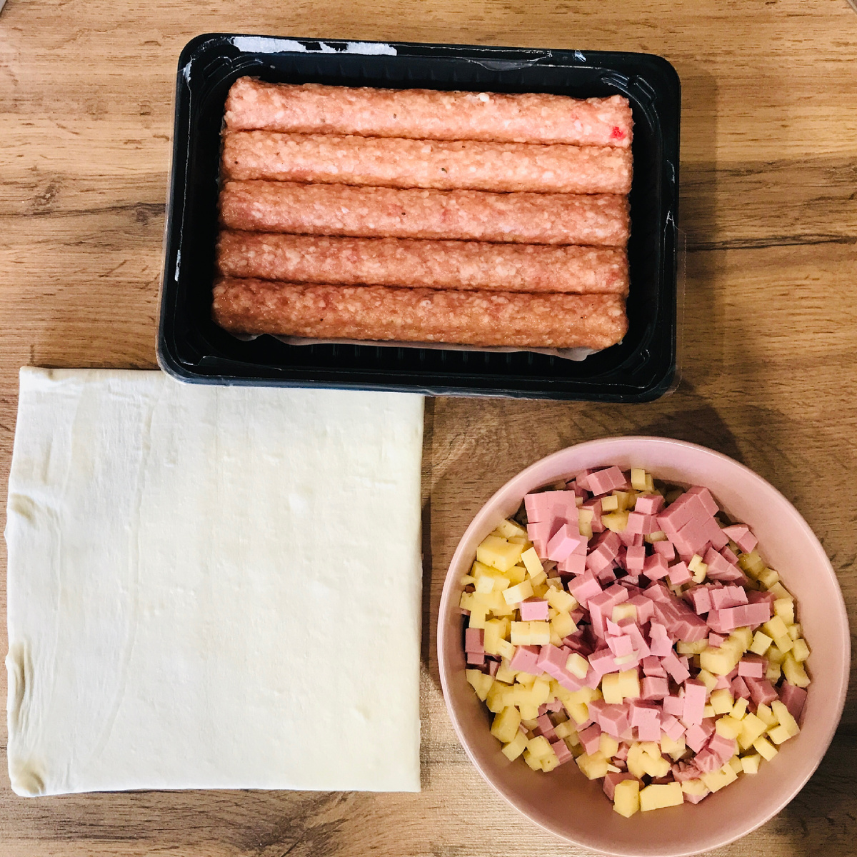 Для приготовления понадобятся: У меня в холодильнике были чевапчичи из курицы, вареная колбаса и сыр Подготавливаем все ингредиенты. Нарезаем и замешиваем все что необходимо. Раскатываем тесто как можно тоньше и режем на полоски шириной около 8 см. Затем накладываем начинку и сворачиваем в колбасу Подготавливаем форм и укладываем спиралью наши пироги Ставим в духовку на пол часа градусов на 200 и пирог готов!