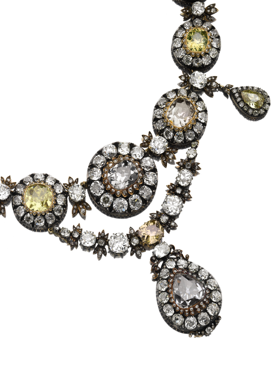 Две грандиозных драгоценности, оба произведения имеют исключительную историческую ценность и связаны с российским императорским двором. Первое — это великолепное бриллиантовое колье с изящной застёжкой в виде банта. Предположительно, первоначально он был заказан как две разные драгоценности Екатериной Великой (1729-1796) в качестве украшения, которое пережило столетия и хранилось в надежном помещении в Кремле. Это ожерелье стало частью частной коллекции после аукциона «Русские государственные драгоценности» 1927 года, где оно находится и по сей день. Ожерелье с застёжкой-бабочкой, оценённое перед продажей в 3–5 миллионов долларов, было изготовлено примерно в 1760–1780 годах, и его дизайн вполне соответствует стилю конца XVIII века. Второй лот состоит из целого набора, образующего одну из самых важных пар ювелирных изделий с цветными бриллиантами, которые выставлялись на аукцион за последние 50 лет. Связь с драгоценностями российской императорской короны прослеживается в бриллиантах, к