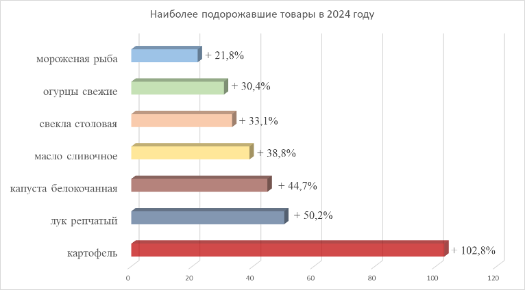 - картофель (кг) на рекордные 102% (с 28,04 руб. в декабре 2023 года до 56,9 руб. в декабре 2024 года);