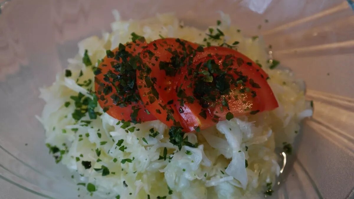 Салат «Крестьянский» с квашеной капустой — простое блюдо с острыми нотками: пряность в заправке подчеркнет вкус
