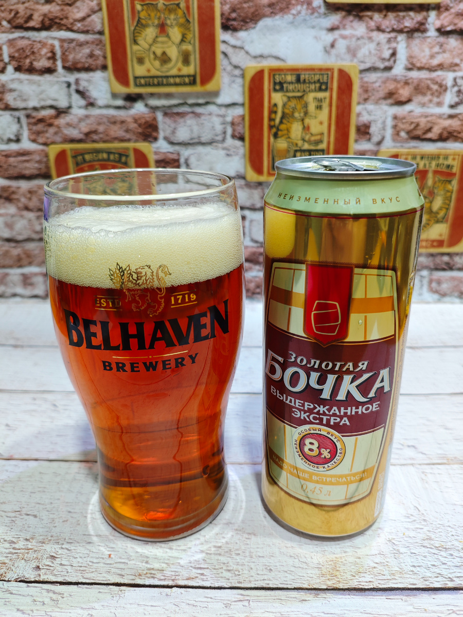 Изготовитель: АО "АБ ИнБев Эфес". Пиво сварено в городе Калуга. На сайте пивоварни описание следующее: «Золотая Бочка Выдержанное Экстра» – специальный темный сорт с крепостью 8 %. Отличается богатым пивным вкусом и ароматом. Большая крепость достигается более длительным временем созревания пива. Именно это придает ему прозрачность, неповторимый вкус и терпкость. ********************************************************************************** Плотность: 14.9%. Состав: вода питьевая, солод пивоваренный ячменный, хмель и хмелепродукты. Срок годности: 12 месяцев при температуре хранения от +2℃ до +30℃. С даты розлива моей банки прошло чуть более 6-ти месяцев. ********************************************************************************** Пена на месте и раствориться в первые же секунды не спешит. Аромат солодово-хлебый, слегка жжёный, с интенсивным карамельным оттенком. Приятный. Карбонизация умеренная. Вкус в целом полностью соответствует ароматике. Солод, слегка жжёный хлебушек, и