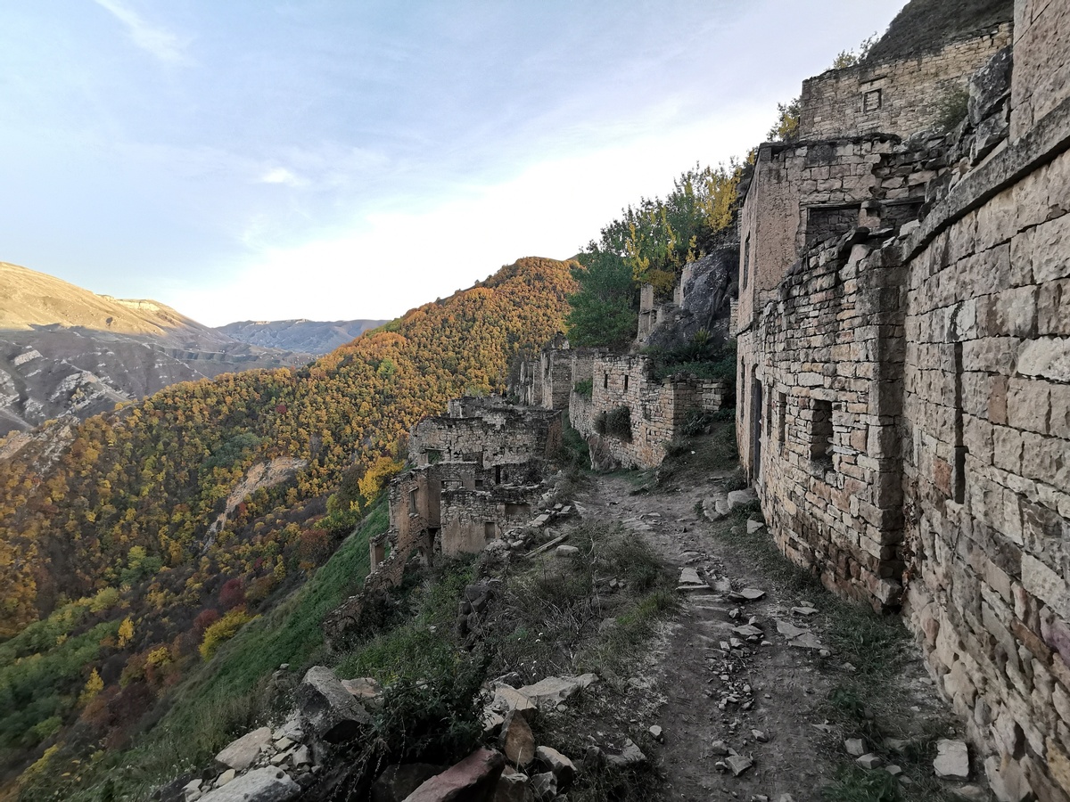 Продолжаем изучать руины Гамсутля. Хотя как руины. Иногда кажется, что жители покинули село только вчера... Вот перед нами центральная улица: Хотели бы дома такой вид с балкона? Кажется, что аул будто врос в горы - древние строители использовали скалы в качестве стен домов, что делало их прочными и безопасными. Для застройки задействован буквально каждый сантиметр доступного пространства, что создает ощущение лабиринтов, схожих с перуанским Мачу-Пикчу. Конечно, у любителей просторных улиц здесь неизбежно случится приступ клаустрофобии... По некоторым домам видно, что они покинуты давно... Крыши тут делались из балок, глины и сена, и их природа уничтожила быстро… А вот стены, арки, лестницы - на месте! Кое-где сохранились даже деревянные двери! Заходите, гости дорогие! За всю историю нога вражеского воина ни разу не ступала сюда. Думаю, не надо объяснять, почему... Хотели бы дома такой вид с балкона? А в домах все, как будто их покинули только вчера. Кое-где есть рамы на окнах, в пустых