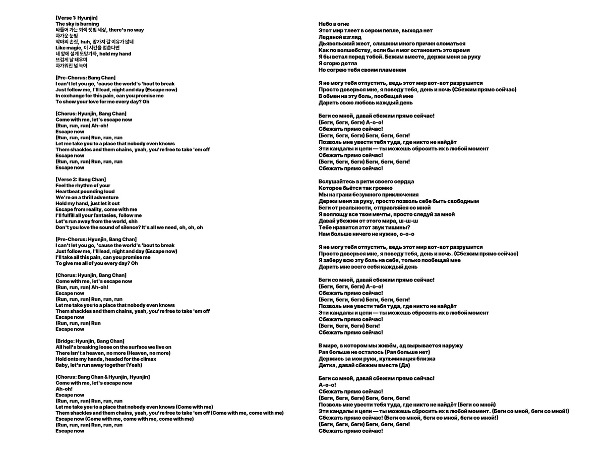«Escape» – совместный трек Бан Чана и Хёнджина, буквально наполненный вайбом "Нас не догонят" 😂 Или подростковым бунтом, где гормоны кипят, гармонь играет, шило в одном месте, хочется что-то делать, ну и надо бежать (собственно, название говорящее), вырываться из оков, сдерживающих неуёмную энергию.
