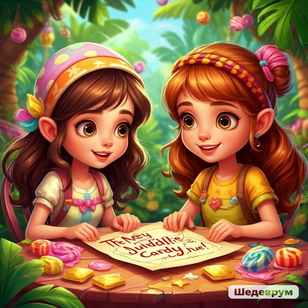После восстановления Волшебного Источника Лиза и Катя думали, что их приключения на время закончились. Но однажды утром, когда они завтракали, на столе появился странный конверт, украшенный золотыми узорами. Внутри была карта с надписью: *"Джунгли Сладостей ждут вас!"* — Джунгли Сладостей? — удивилась Катя. — Это звучит вкусно! — воскликнула Лиза. — И интересно, — добавил Коржик, выглянув из кармана Кати. — Может, это новое приключение? Не раздумывая, девочки и их друзья отправились по указанному на карте маршруту. Они прошли через старый дуб, и перед ними открылся портал, ведущий в удивительный мир. Когда они шагнули внутрь, то оказались в густых джунглях, но это были не обычные джунгли. Вместо реки здесь тек молочный шоколад, а на деревьях росли конфеты всех форм и размеров. Воздух был наполнен ароматом ванили, карамели и свежей выпечки. — Это рай для сладкоежек! — восторженно сказала Лиза. — Но будьте осторожны, — предупредила Луна. — Даже в таком сладком месте могут быт