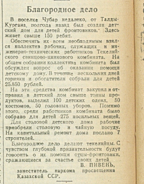 В этот день, 24 марта 1945 года, газета «Казахстанская правда» публикует заметку о коллективе работников Текелийского свинцово-цинкового комбината, собравших для детского дома 25.850 рублей. В посёлке Чубар недалеко, от Талды-Кургана, полгода назад был создан детский дом для детей фронтовиков. Здесь живёт свыше 150 ребят. Обеспечить их всем необходимым взялся коллектив рабочих, служащих и инженерно-технических работников Текелийского свинцово-цинкового комбината. На общем собрании коллектива комбината был обсуждён вопрос об оказании помощи детскому дому. В течение нескольких дней горняки и обогатители собрали для детей 25.850 рублей. На эти средства комбинат закупил и отправил в детский дом свыше тонны продуктов, выделил 100 детских одеял, костюмов, 50 головных уборов. Помимо этого, среди работников комбината было собрано для детей - 275 носильных вещей. Для столовой детского дома рабочие приобрели столовую и чайную посуду. На капитальный ремонт дома послано 7 строителей. Благородное д