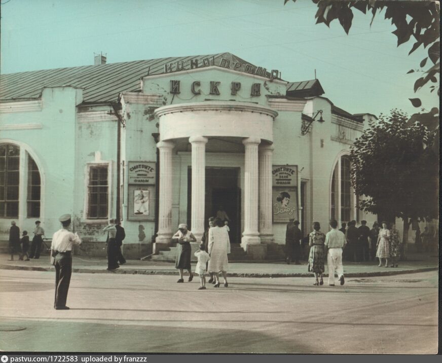 В 1957 году кинотеатр «Искра» в Арзамасе выглядел так. Это фото из архива историко-художественного музея г. Арзамаса, я его нашла на сервисе pastvu. Еще летом 2022 года мелькали по сети новости, что кинотеат