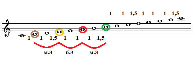 Как видим, малый минорный септаккорд образуется путем добавления к минорному трезвучию малой терции. Получается созвучие, в котором нижняя терция малая, средняя - большая, верхняя - малая. Как и в малом мажорном септаккорде (доминантсептаккорде), в малом минорном септаккорде верхняя ступень отстоит от тоники на малую септиму. Давайте посмотрим и послушаем, какие получаются созвучия: