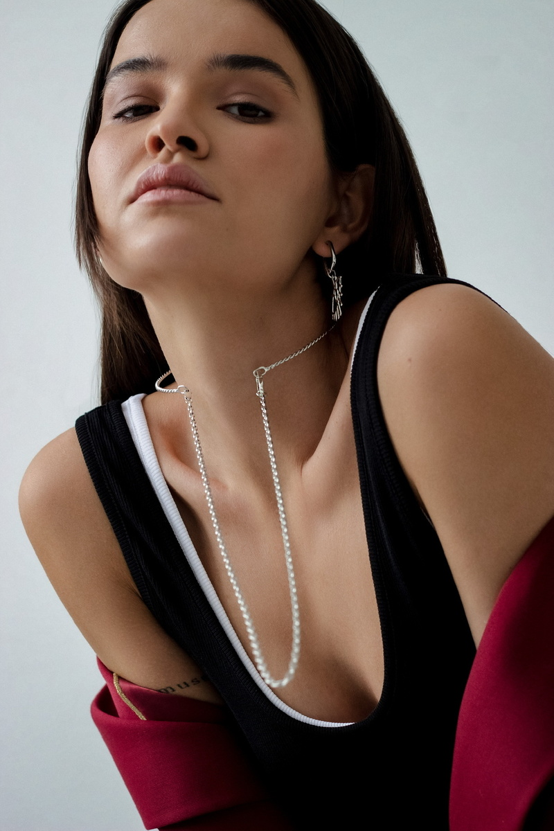 Продолжаем видеть «необычное в обычном» и реализуем творческий подход к носке любимых украшений. Когда, как не весной, экспериментировать и радовать себя (и окружающих) стильными ювелирными сетами? Поворот на 180 градусов подарил нам еще один необычный способ носки серебряного каркасного колье «Сближение». Стоит только «пустить» цепочку по спине, как образ сразу получит новое звучание. Предлагаем дополнить колье серебряной основой-крестом «Святая» с горным хрусталем, чтобы создать характерную акцентную деталь. Серебряная моносерьга булавка gold — украшение с самым большим экспериментальным потенциалом. Уже несколько раз делились с вами небанальными способами носки этой лаконичной серьги, а сегодня решили использовать ее как подвеску и надеть на базовую серебряную цепочку «Якорное плетение» с крупными звеньями. Получилось просто, лаконично и очень стильно! Еще один способ носить серебряную моносерьгу булавку — превратить ее в стильный обвес. Остается только надеть на нее любимые подвеск