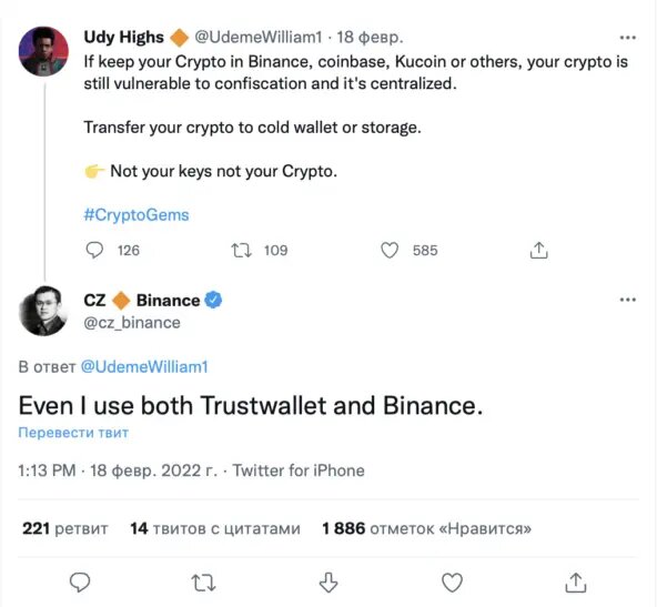 Глава Binance не раз подчеркивал, что хранит свои средства в Trust Wallet, который был приобретен биржей в 2018 году. Кошелек доступен исключительно на мобильных устройствах, и его можно скачать в официальных магазинах Apple, Google и Android. Trust Wallet получил популярность благодаря поддержке множества блокчейнов — 53, что позволяет хранить более 160 000 активов. Кошелек является децентрализованным и не хранит личные данные пользователей. Однако его связь с Binance вызывает некоторые опасения у части крипто-энтузиастов из-за возможного конфликта интересов.