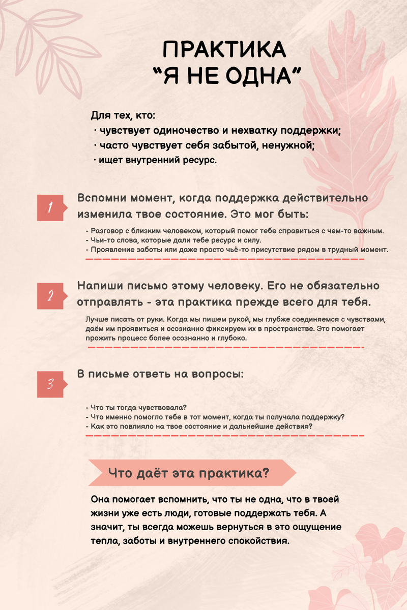 Для тех, кто: • чувствует одиночество и нехватку поддержки; • часто чувствует себя забытой, ненужной; • ищет внутренний ресурс. Цель этой практики - помочь тебе осознать, что поддержка уже есть в твоей жизни, и заново активировать это ощущение внутри. Как выполнить: 🦋 Вспомни момент, когда поддержка действительно изменила твое состояние. Это мог быть: - Разговор с близким человеком, который помог тебе справиться с чем-то важным. - Чьи-то слова, которые дали тебе ресурс и силу. - Проявление заботы или даже просто чьё-то присутствие рядом в трудный момент. 🦋 Напиши письмо этому человеку. Его не обязательно отправлять - эта практика прежде всего для тебя. 🔹Можно написать в заметках, но лучше всего делать это на бумаге. Почему лучше писать от руки? Когда мы пишем рукой, мы глубже соединяемся с чувствами, даём им проявиться и осознанно фиксируем их в пространстве. Это помогает прожить процесс более осознанно и глубоко.🔹 🦋В письме ответь на вопросы: - Что ты тогда чувствовала?
