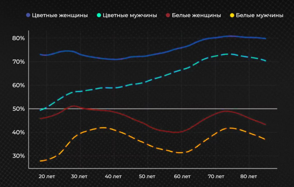 Примечательно, что "цветных" мужчин возраста 18-30 лет, голосовавших за Трампа, также больше, чем представителей любых других возрастов.