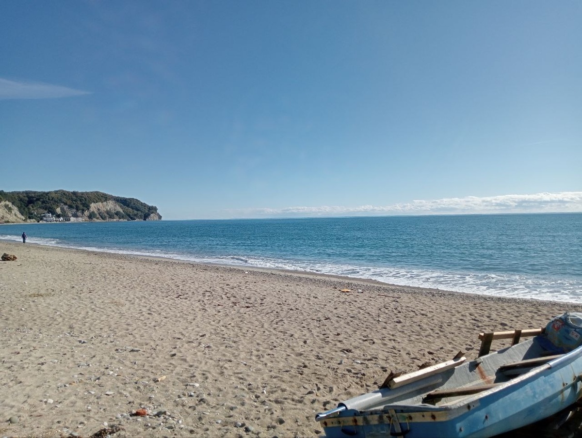 В этот день было два участка достойных внимания: Монашеское Ущелье и дорога через Мюссерский заповедник. В первую половину маршрута доехали от Бзыби до Лидзавы. Погода солнечная. Не ноябрь, а август. В Лидзаве протяженный пляж. Пожилые туристы вовсю купаются. Пока кипятилась вода для лапши и чая мой компаньон придумал такую дичь. Он ни разу не был на море. Ну, так бывает. И, вот на этом пляже. А картинка там на все пять баллов: песок, волны, рыбацкий мусор. Он решил снять римейк на финальную сцену Достучаться до небес. Ну, когда они добрались до моря. Один сидит, другой стоит. Вместе пьют какой-то буз из бутылки. Потом один падает набок, а другой даже не особенно реагирует. Садится и продолжает прибухивать. Я сначала упирался, мол, уже вода вскипела, пошли лапшу заваривать, надо валить дальше, а то опять будем под мостом в клоповнике ночевать. Но он меня как-то уговорил и мы сняли даже два дубля. И вот, когда эта самая финальная сцена. Он упал на бок и делает вид, что сдох. А я пью сап