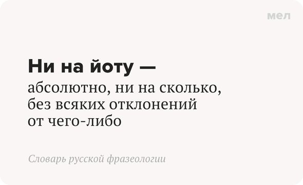 Йота — это i, девятая буква греческого алфавита, обозначающая звук «и». По поводу того, как и почему эта буква попала в состав известного фразеологизма, существует две основные теории. Версия № 1 Выражение восходит к евангельскому изречению (Матфей 5,18) «Ни одна йота, ни одна черта не пройдет (не исчезнет) из закона, пока не исполнится всё». Согласно этой версии, йота — не только буква, но и транскрипционный знак, который ставился над строчными гласными — альфой, омегой, этой. Если йота была — «а», «о» или «е» становились долгими, то есть скорее «пропевались», чем проговаривались. В русском языке таких гласных нет, поэтому понять это не очень просто. То есть пропуск йоты ничего радикально не менял — отсюда у этого слова появилось значение чего-то мелкого или незначительного. В евангельском изречении говорится о том, что недопустимы даже малейшие изменения в законе (а точнее, в религиозных предписаниях Моисея): не только текст закона не может быть изменен, но и ни одна буква, ни одна ч