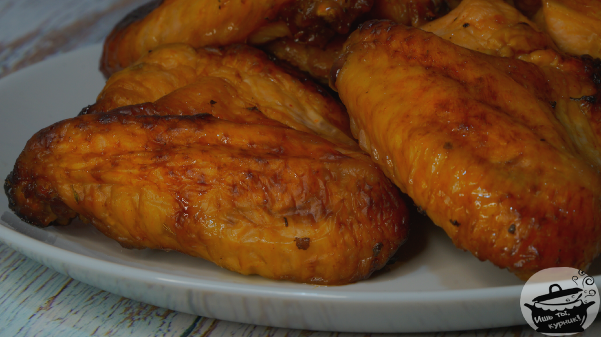 Ингредиенты: · крылья – 800 гр.; · мёд – 3 ст.л.; · соевый соус – 3 ст.л.; · красный молотый перец – ½ ч.л.; · чёрный молотый перец – ½ ч.л.; · чеснок – 3 зубчика. Приготовление: Чеснок измельчить. Смешать маринад из меда, соевого соуса и специй с чесноком до однородной массы. Тщательно обмазать крылья маринадом, накрыть плёнкой и убрать в холодильник на 3-4 часа. Выложить крылья на решетку и запекать в предварительно разогретой до 180 °С духовке в течение 45 минут. Приятного аппетита!