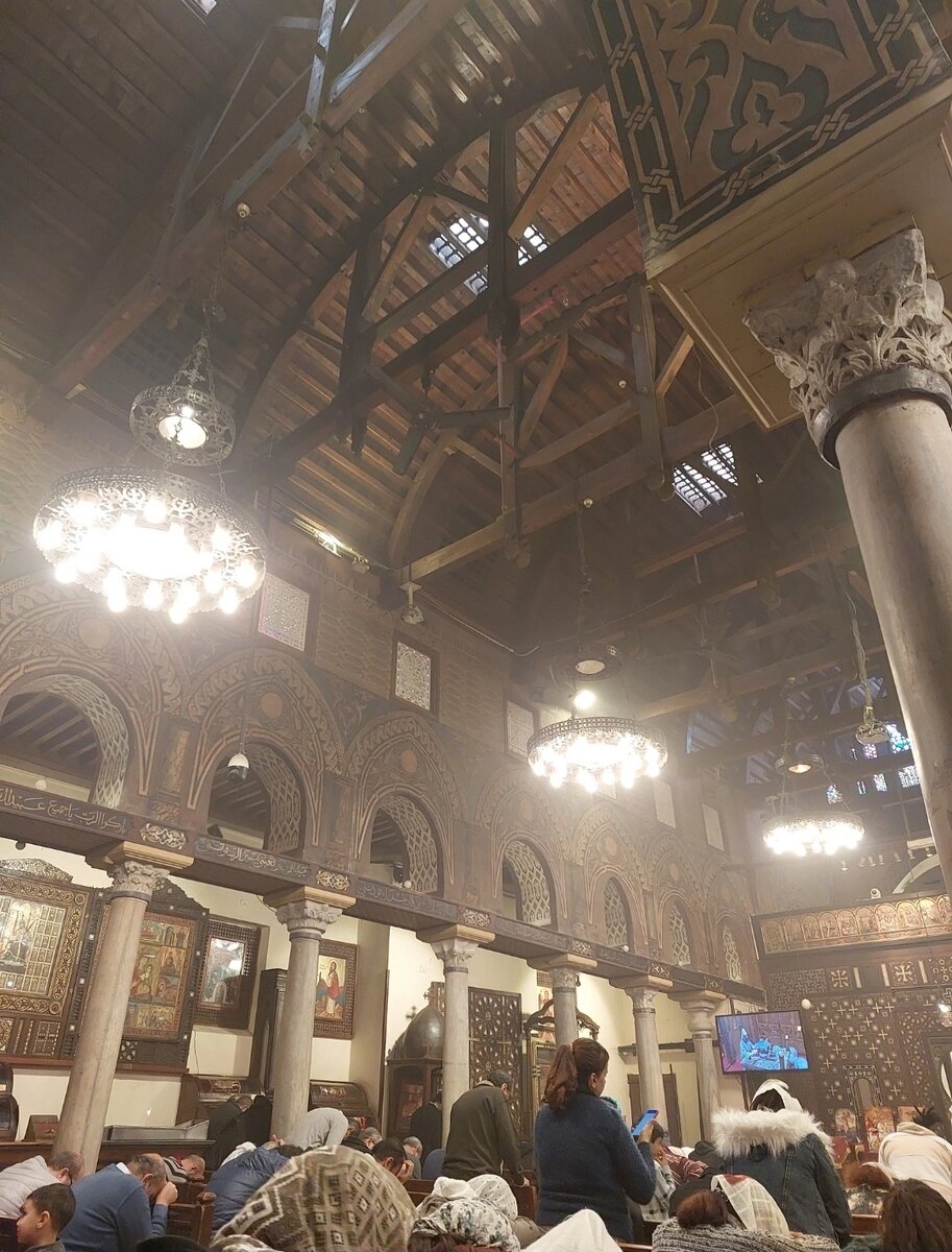 Сначала немного информации о коптах: считается, что это прямые потомки древних египтян. Само слово "копт" произошло от греческого слова "айгюптос" и означает просто "египтянин". Но сегодня так называют только особые группы христианского населения Северной Африки - в основном Египта и Эфиопии. Большинство коптов называют себя православными, но в мире их считают представителями "древних восточных" или "дохалкидонских" церквей. Сама церковь очень красивая. Дворик перед ней украшен мозаичными фресками, их вы можете увидеть на фото в предыдущем посте. Войдя в саму церковь, мы попали на службу. Внутреннее убранство очень необычное и красивое. Стоят лавочки, чтобы прихожанам было удобно и комфортно. Также наше внимание привлекли иконы. Путешествуя, мы заметили, что каждый народ рисует иконы со своими национальным особенностями: в России - европейские черты лица, в Грузии на Вас будут смотреть лики с кавказскими чертами, в Египте иконы были ещё необычнее, и даже на иконе с Георгием-победон