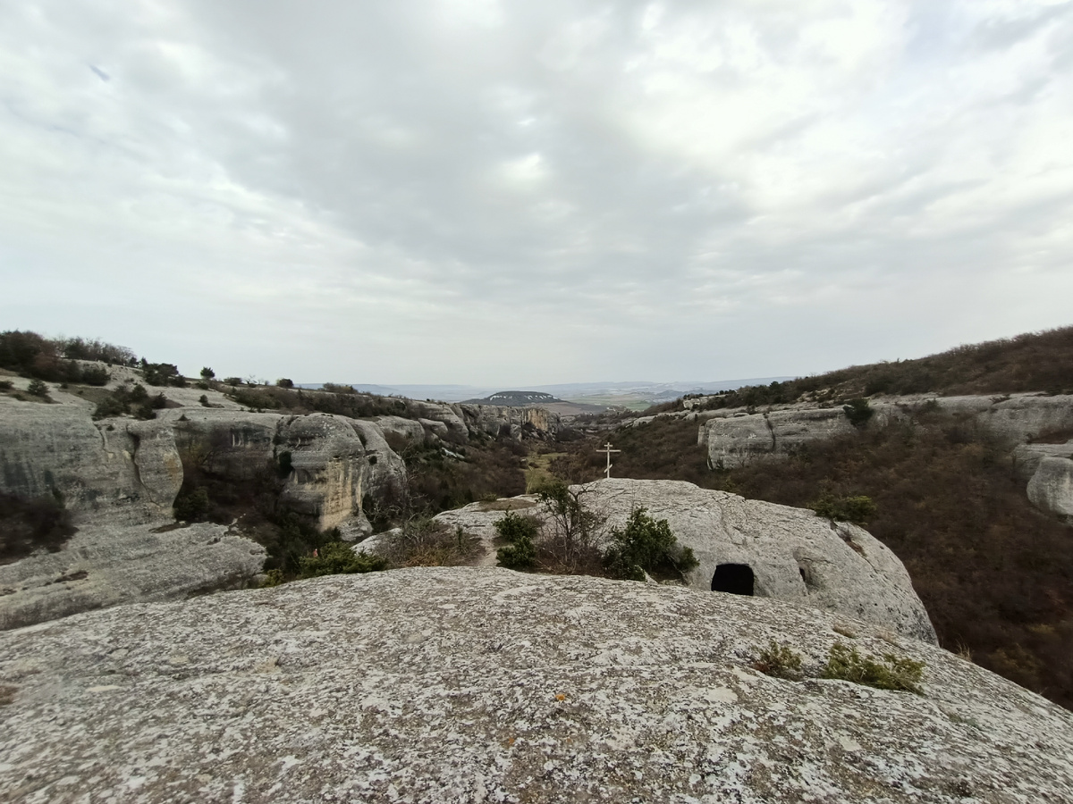 Путь по верху в начале по голой горе, потом впереди показались кусты, пролезать через которые было бы вредно, поэтому выбрал единственную тропу (что-то протоптанное может быть людьми, а может быть козами или кабанами, следу которых встречались достаточно часто) со стороны Эски-Кермен, по краю скалы. Скала тянулась и тянулась, а тропа то приближалась к краю, но немного отдалялась, пока в один "прекрасный" момент не исчезла... Но по карте метрах в ста в стороне другого склона с видом на храм Донаторов, должна быть уже тропа, туда и пошёл через кустарник. Сто метров - не километр.