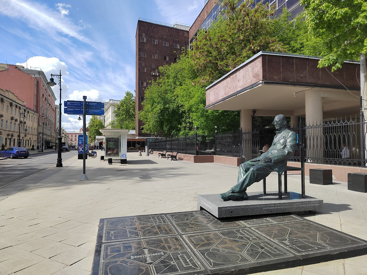 Прогуливаясь по Мясницкой, вы наверняка замечали мужика в сюртуке любопытный памятник: сидящий на стуле над непонятной картой очкарик. Если присмотреться, что с боку памятника видно, что на стуле сидит архитектор с мировым именем - Ле Корбюзье, а памятник - дар Алишера Усманова. Если с Усмановым более-менее ясно (написано же, что это меценат ☝), то с Ле Корбюзье не так все очевидно современному обывателю, если кратко - это архитектор международного уровня, создатель нового стиля архитектуры. Размеры здания поражают воображение, оно воплощает пять основных принципов Ле Корбюзье в архитектуре: Здание выходит сразу на две улицы: Мясницкую и проспект Академика Сахарова. Его фасады отделаны армянским туфом и имеют приятный розовый оттенок, и это уже было нарушением плана Ле Корбюзье, кстати.