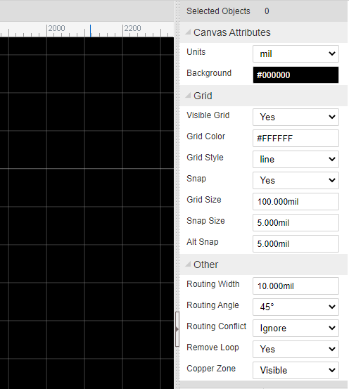 После первоначального преобразования схемы в печатную плату, пришло время узнать, как управлять редактором PCB Design Editor от EasyEDA. Многие атрибуты холста печатной платы аналогичны атрибутам холста схемы. Ключевым моментом является то, что вы можете задавать единицы измерения (units) в атрибутах холста печатной платы. Когда вы выбираете объект на холсте, вы можете изменить его атрибуты на правой панели. Snap Size: Размер привязки курсора. Alt Snap: При нажатии горячей клавиши ALT размер привязки курсора - Other