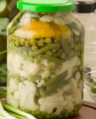 Ингредиенты: На 1 кг зеленого горошка: - 1 кг цветной капусты - 1 кг зеленой стручковой фасоли - 60 мл 9%-ного уксуса - 15 г зеленой петрушки и укропа - 8-10 горошин черного перца Приготовление: Зеленый горошек нужно пробланшировать в течение 3-4 минут в кипящей воде. У стручков фасоли предварительно обрезать концы, нарезать на кусочки размером 2-3 см, также пробланшировать около 3-4 минут и остудить в холодной воде. Цветную капусту разделить на кочешки и пробланшировать в подсоленной кипящей воде (10 г соли на литр воды) примерно 5-6 минут, после чего охладить в холодной подсоленной воде. В подготовленные банки добавить уксус, затем специи и уложить овощи слоями. Все залить горячим рассолом из соли и сахара. Банки объемом 0,5 литра стерилизуют 15 минут, литровые — 20 минут, двухлитровые — 25 минут. После этого сразу закатывают.