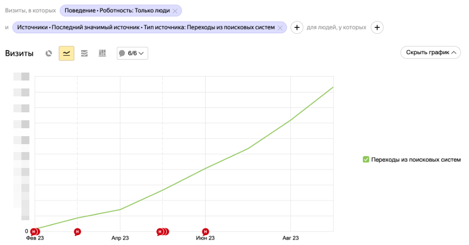 Рост трафика. Переходы из поиска выросли на 660% в трафике за 7 месяцев. Основной прирост трафика пришёлся на коммерческие запросы, что помогло привлечь заинтересованных клиентов.