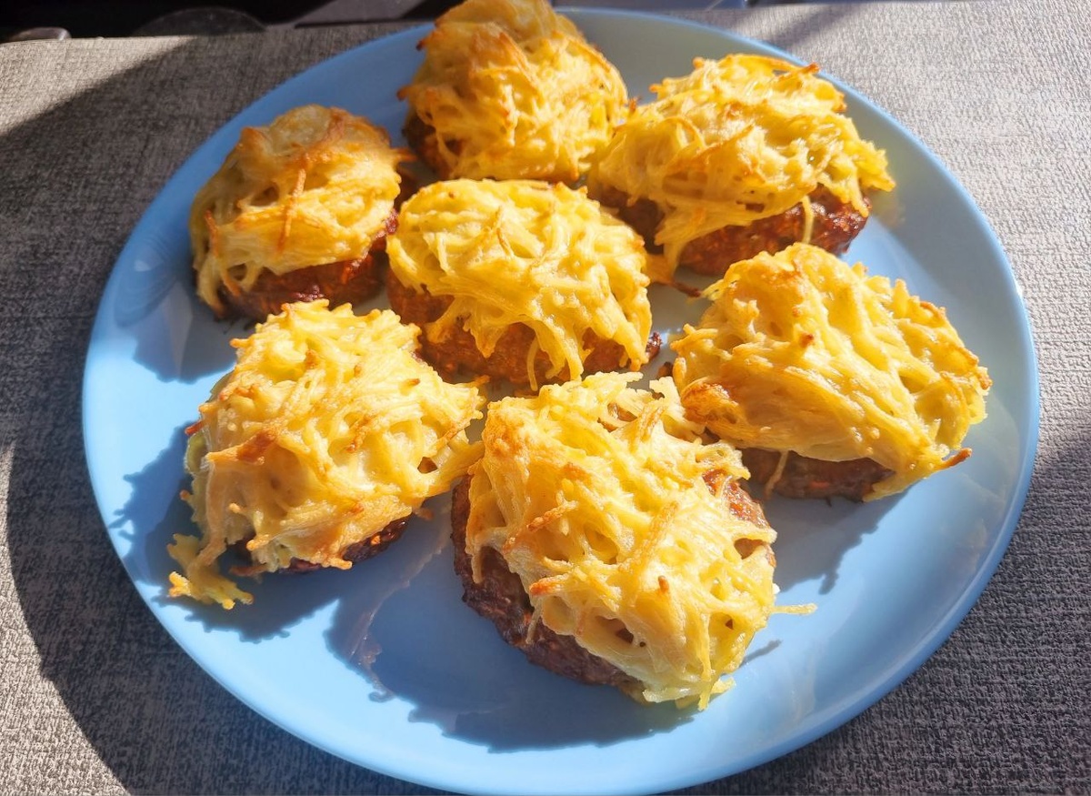 Мясные оладьи, запеченные под шапкой из безглютеновой лапши