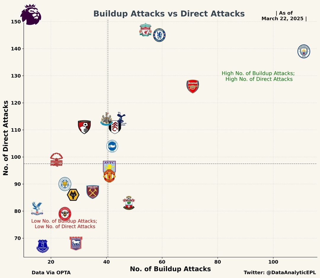 Диаграмма статистического портала данных Opta, рассказывает о сравнении позиционных атак (Buildup Attacks) и вертикальных атак (Direct Attacks) команд Премьер-лиги.
