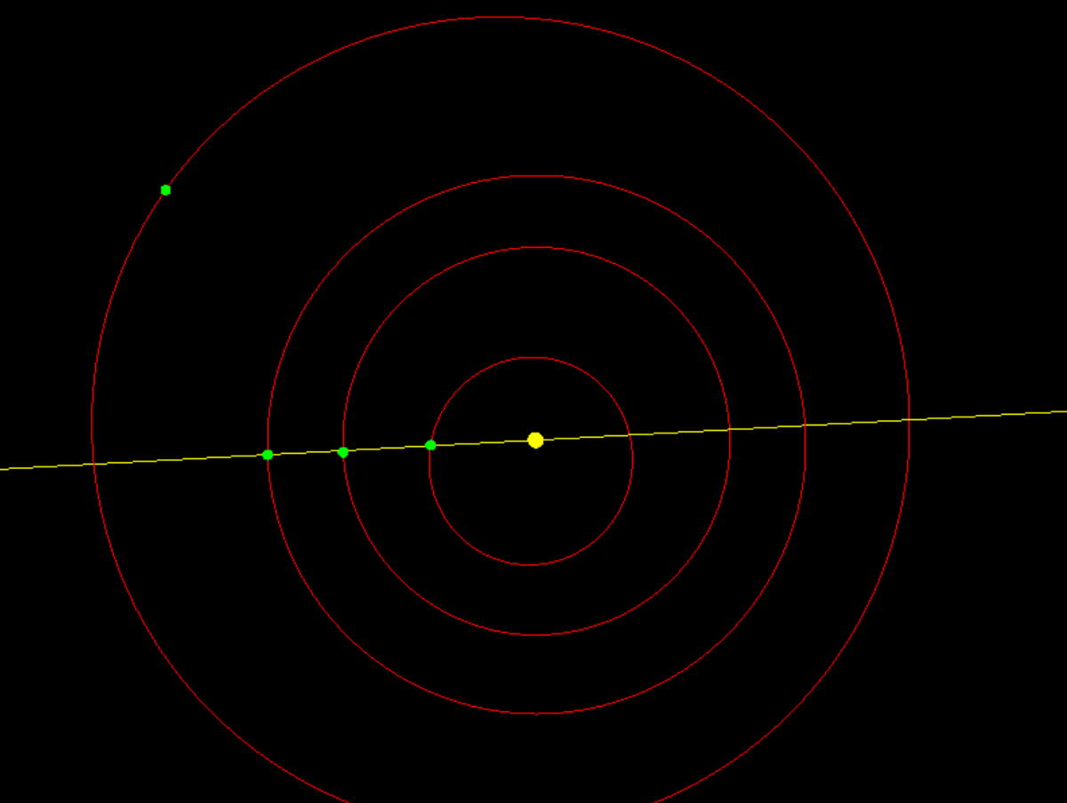Иллюстрация - схема расположения трех планет, четвертая точка выше линии - Марс. Взято со страницы Лаборатории солнечной астрономии https://xras.ru/