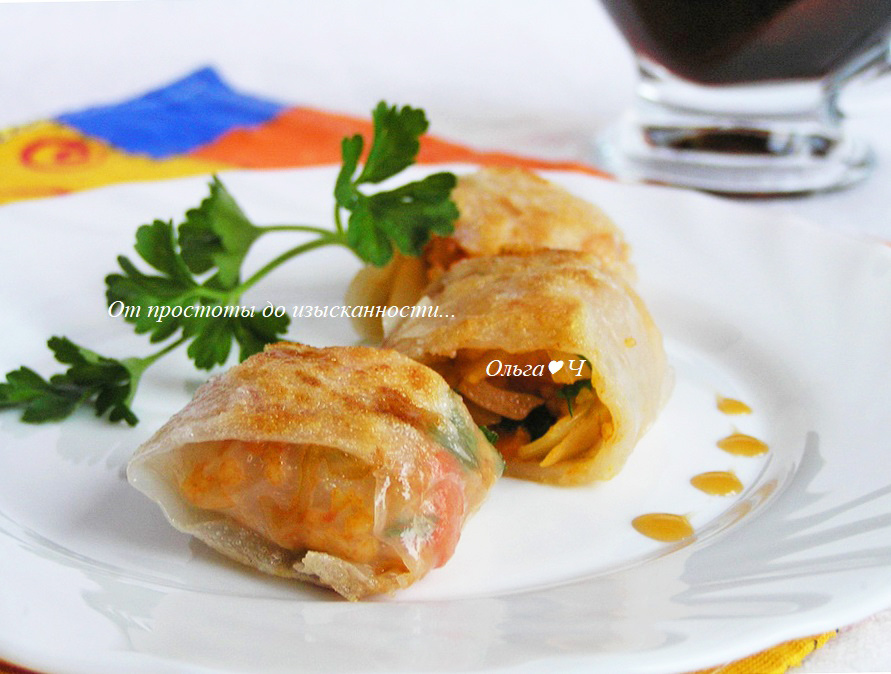 "В странах южно-восточной Азии спринг-роллами называют целую группу холодных закусок, завернутых в блинчик, рисовую бумагу или другое тонкое тесто. Начинки могут быть самыми разнообразными: от рыбных и мясных, до ягодных и фруктовых. Такие блинчики можно кушать в «сыром» виде, как закуску или основное блюдо, а можно поджарить на гриле до золотистой корочки. "Источник здесь)