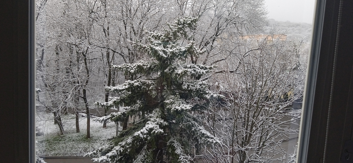 Стоило лететь за тысячу с лишним километров, чтобы услаждать взор видом морозного снежного утра, серого неба и густого, непрозрачного тумана? На юг, между прочим, из наших северных широт. Однозначно, стоило. Это как разворачивать долгожданный подарок: рвешь шелестящую упаковочную бумагу, а под ней - ещё одна обертка! И вот так, с обрывками бумаги, множится и растягивается удовольствие, предвкушение сюрприза. Ковры первоцветов не открылись мне сразу. Виды гор скромно прятались за туманной завесой. Вот он, вид из окна воскресным утром в Железноводске: А в Пензе, между прочим, в это время светило солнце и погода располагала к долгим приятным прогулкам. Не то что здесь. Что ж, после обеда от снега не осталось и следа, а я с наслаждением наблюдала, как из-под снега целехонькими выглядывают поляны пролесок, фиалок и хохлаток. Это стоило того, чтобы подождать. Цветут вишни, форзиции, бузина развернула листочки, прямо под окнами булькает кукушка (никогда не слышала кукушку в городе!), всюду