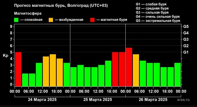 Метеозависимые жители Волгоградской области могут почувствовать влияние вспышки на Солнце. По прогнозам астрофизиков, мощность магнитных бурь будет небольшой. Фото: Лаборатория солнечной астрономии ИКИ и ИСЗФ РАН Жители Волгоградской области могут столкнуться с последствиями вспышки на Солнце. Специалисты лаборатории солнечной астрономии ИКИ и ИСЗФ РАН предупредили о возникновении магнитных бурь три дня подряд. Согласно прогнозам астрофизиков, первая из них класса G1 проявила себя минувшей ночью с 00:00 до 03:00. Во вторник, 25 марта, на Земле ожидается магнитная буря мощностью 5 баллов, что также относится к классу G1. Она может возникнуть с 18:00. В ночь 26 марта геомагнитные возмущения продолжатся. С 00:00 до 03:00 буря G1 может достигнуть значения 6. Смотрим «Вести. Волгоград»: smotrim.ru/Volgograd Подписывайтесь на наши страницы в соцсетях: Telegram, ВКонтакте, Одноклассники, Дзен