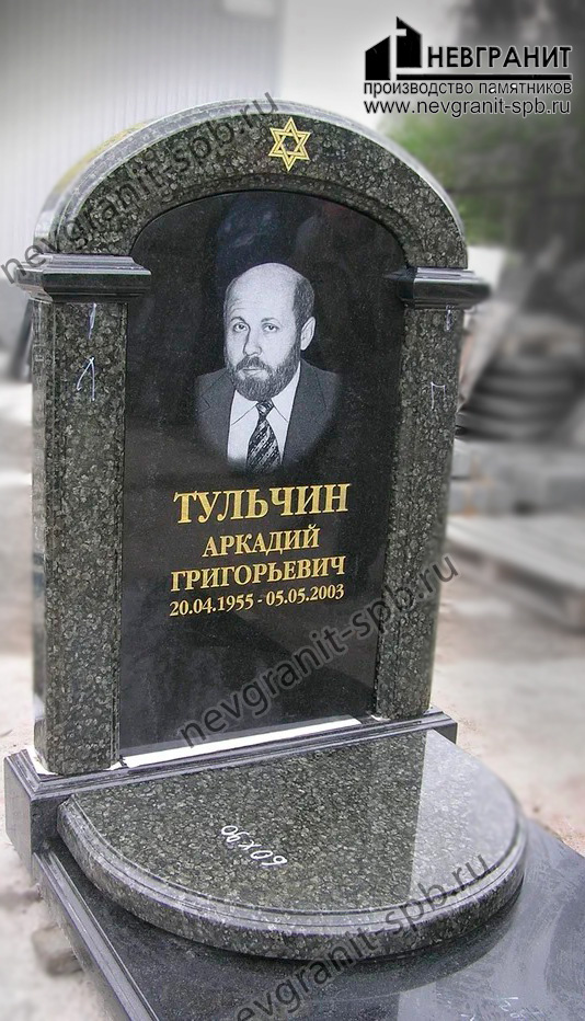 На фотографии – пример лаконичного и строгого памятника, созданного компанией "Невгранит". Памятник изготовлен из гранита с мелкими вкраплениями разных оттенков, что придает ему благородный вид. Форма памятника – прямоугольная арка, смягченная закругленным верхом. На лицевой стороне выгравирован портрет Тульчина Аркадия Григорьевича, а ниже – его имя, отчество, фамилия и даты жизни (20.04.1955 - 05.05.2003), выполненные золотистым шрифтом. В верхней части памятника изображена Звезда Давида, указывающая на вероисповедание усопшего. Простота форм и сдержанная цветовая гамма подчеркивают достоинство и уважение к памяти покойного. Этот памятник – пример качественной работы и внимательного подхода к деталям, характерных для мастеров "Невгранит". Более подробную информацию, вы можете узнать по телефону : +7-931-340-96-76 вацап/телеграм Оставайтесь на связи: Следите за нашими новостями и акциями в социальных сетях и на сайте! · Сайт: www.nevgranit-spb.ru · Телеграмм: https://t.me/nevgran