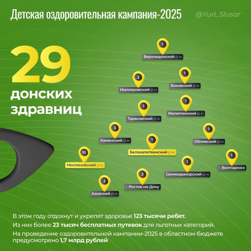 На Дону стартовала оздоровительная кампания для школьников. Более 1000 юных дончан – дети участников СВО и из малоимущих семей – отправились отдыхать в санатории Дона и Ставрополья. Об этом в своем телеграм-канале сообщил глава Ростовской области Юрий Слюсарь. Почти 600 ребят отправились в донские здравницы, а около 500 детей отдохнут в санаториях Ставрополья. Во время весенних каникул школьники хорошо отдохнут и пройдут санаторное лечение. «Там ребят ждут не только новые впечатления и знакомства, но и процедуры по лечению органов дыхания, сердечно-сосудистой системы, опорно-двигательного аппарата», – сообщил глава Ростовской области. Юрий Слюсарь подчеркнул, что к организации отдыха и оздоровления детей в Ростовской области подошли максимально внимательно. «Донские здравницы соответствуют всем санитарно-эпидемиологическим требованиям. Все лагеря проходят строгие проверки, и мы уверены, что каждый ребенок будет находиться под надежным присмотром», – уточнил глава донского региона. В му