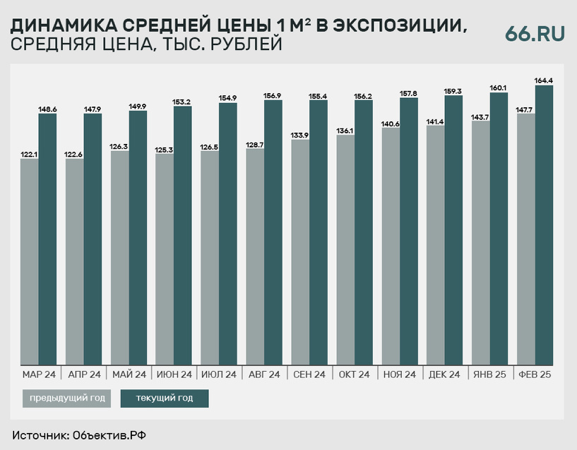 Средняя стоимость квадратного метра жилья на первичном рынке Екатеринбурга в феврале 2025 года достигла отметки в 164,4 тыс. рублей. Это на 4,3 тыс. рублей больше, чем в предыдущий месяц, следует из данных сервиса цифровой аналитики «Объектив.РФ». По мнению аналитиков сервиса, квартиры в новостройках продолжают дорожать из-за того, что девелоперы используют альтернативные схемы продаж. При субсидировании ипотечной ставки или первоначального взноса стоимость недвижимости неизбежно повышается. «Коммерческие субсидии, которыми девелоперы вынужденно стимулируют спрос, всегда отражаются в заявленной прайсовой стоимости квартиры, соразмерно увеличивая ее. При этом мы наблюдаем «статистический рост» показателя средней цены квадратного метра, который несколько не соответствует реальной рыночной ситуации со стагнирующим спросом», — считает глава экспертного центра компании «Объектив.РФ» Ксения Чернецкая. По оценкам экспертов, средняя цена квадратного метра будет расти и дальше. На это указывает