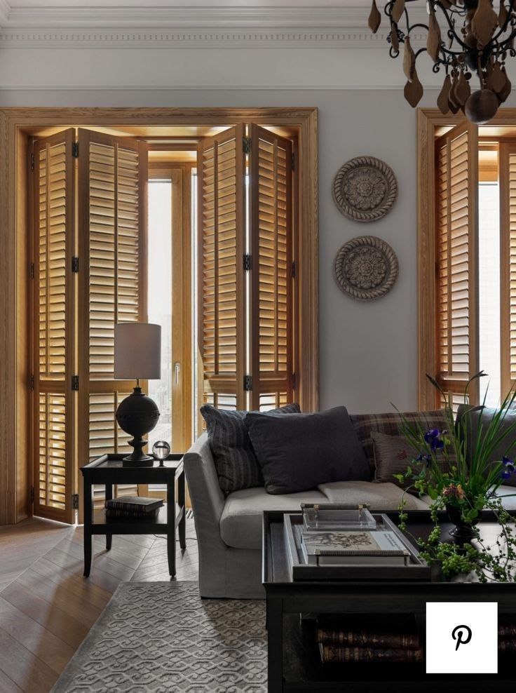 Ставни — это не просто защита от солнца и посторонних глаз, но и стильный элемент декора, который способен преобразить любое окно. Они создают уютную атмосферу, добавляют дому шарм и аутентичность. Особенно эффектно смотрятся ставни на высоких окнах, таких как панорамные или окна от пола до потолка. Однако для таких окон важно учитывать размер створок в сложенном положении. Вероятней всего они будут выходить за пределы откосов (это видно на изображениях), а потому этот момент нужно учитывать и не располагать ставни в проходных зонах или, например, рядом со шкафами (как на 3ем фото).