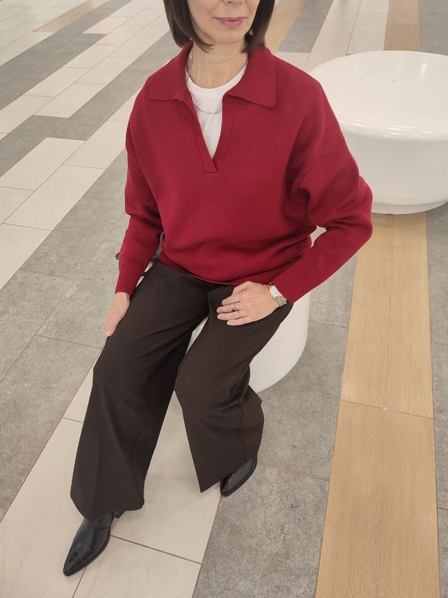 Мой выбор пал на глубокий вишнево-бордовый цвет, который оказался в тренде этого сезона. Этот свитер-поло не только добавит стильности вашему наряду, но и обеспечит тепло в холодные весенние дни.