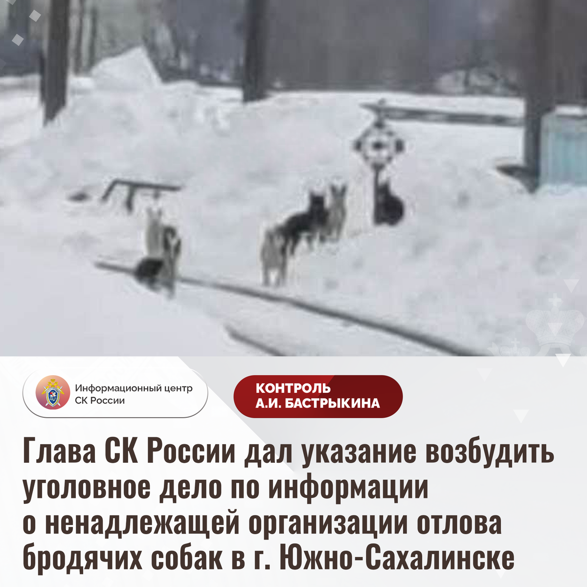 Глава СК России дал указание возбудить уголовное дело по информации о ненадлежащей организации отлова бродячих собак в г. Южно-Сахалинске В социальной сети сообщается, что вблизи жилых домов на улице Пограничной в городе Южно-Сахалинске Сахалинской области обитает стая агрессивных животных, которые неоднократно нападали на прохожих. Местные жители опасаются за свою безопасность, а также за жизнь и здоровье детей. Обращения в местную администрацию результатов не принесли. В СУ СК России по Сахалинской области по данному факту организована процессуальная проверка. Председатель Следственного комитета Российской Федерации Александр Иванович Бастрыкин дал указание руководителю СУ СК России по Сахалинской области Бэликто Балдоржиевичу Базарову возбудить уголовное дело и представить доклад о ходе и результатах его расследования. Исполнение поручения поставлено на контроль в центральном аппарате ведомства. #СледственныйКомитет #СКРоссии #СКР #ИЦСКР #ИнформационныйЦентр #АлександрБастрыкин #Пр
