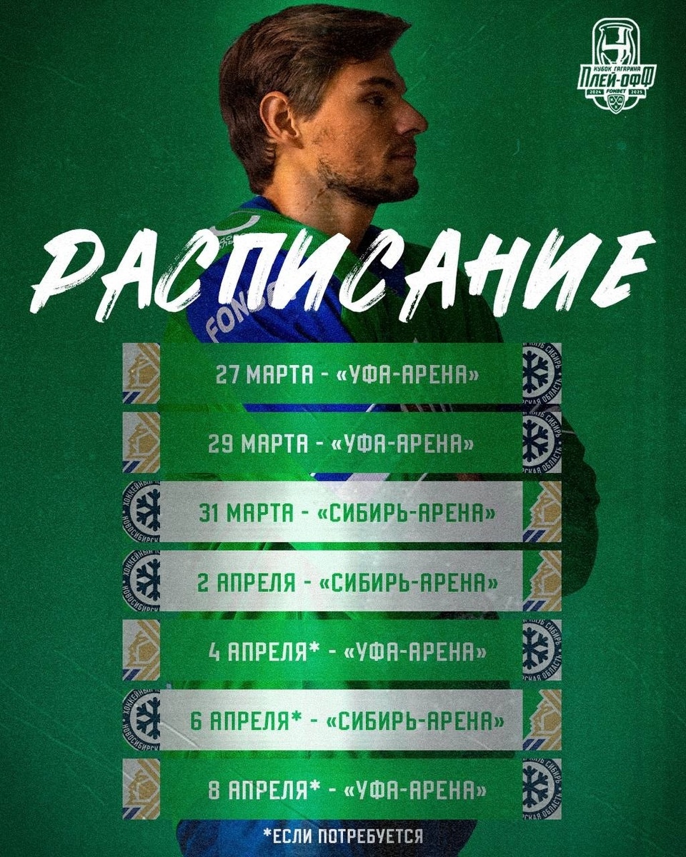 Уфимский «Салават Юлаев» в 1/8 Кубка Гагарина сыграет с командой «Сибирь» из Новосибирска. Это стало известно по завершении последнего тура регулярного чемпионата КХЛ. На судьбу юлаевцев влиял исход встречи в Нижнекамске: здесь «Нефтехимик» обыграл «Адмирал» и оставил дальневосточников на 8-м месте в Восточной конференции. «Сибирь», соответственно, сохранила за собой седьмую позицию. В регулярном чемпионате «Салават Юлаев» и «Сибирь» сыграли четыре раза. В Уфе «СЮ» выиграл 3:1 (Тодд, Хмелевский, Ремпал – п.в.) и уступил 1:4 (Сорокин), в Новосибирске юлаевцы одержали две победы – 3:2 Б (Ремпал, Панин, Хмелевский – п.б.) и 3:1 (Цулыгин, Ливо – бол., Ремпал – п.в.). Серия пройдет до 4 побед одной из команд. Первый матч состоится в Уфе 27 марта. Полностью сетка розыгрыша Кубка Гагарина с указанием дней матчей выглядят так: Запад «Локомотив» (1) – «Торпедо» (8) – 27, 29, 31 марта, 2, 4*, 6*, 8* апреля; «Динамо» Москва (2) – СКА (7) - 27, 29, 31 марта, 2, 4*, 6*, 8* апреля; «Спартак» (3) – «