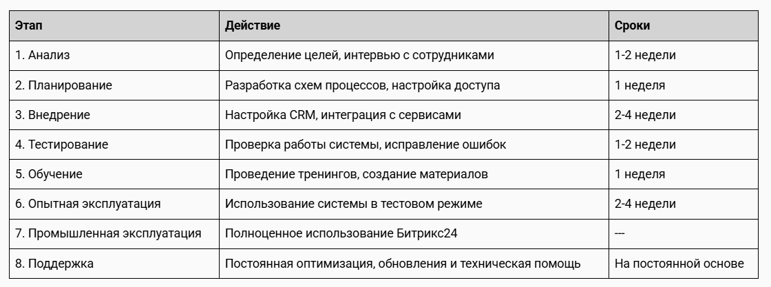 Внедрение Битрикс24 — это долгосрочный процесс, требующий постоянного контроля и доработки. На каждом этапе важно учитывать потребности бизнеса, обучать сотрудников и оптимизировать процессы. После запуска системы необходимо регулярно анализировать ее эффективность, адаптировать под изменяющиеся условия и внедрять новые функции.