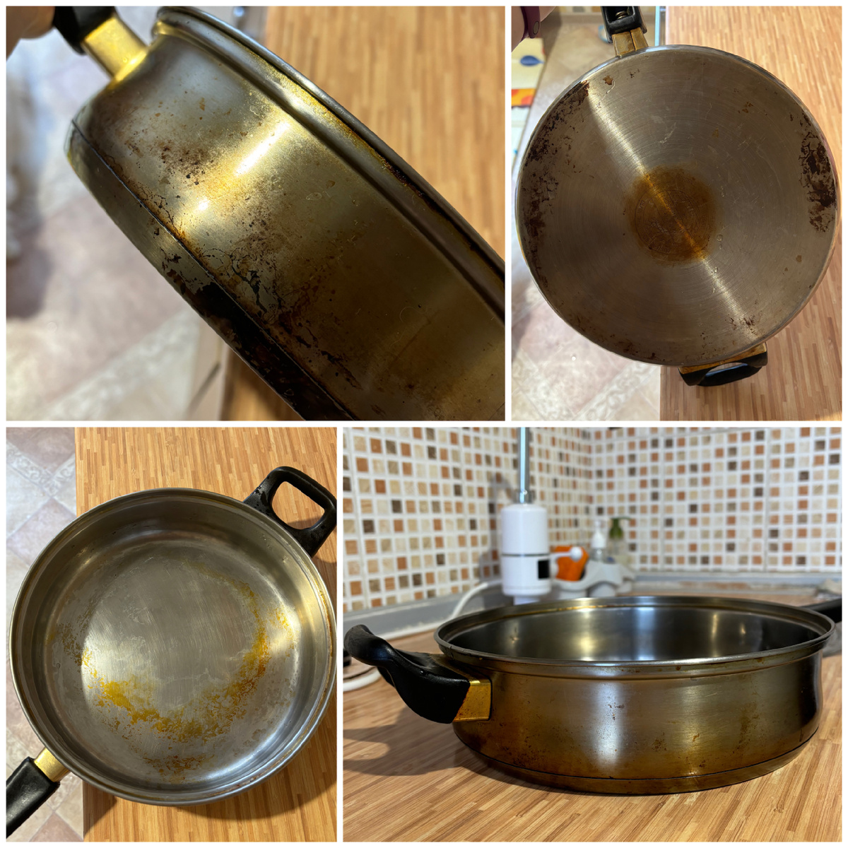 Слышали такое выражение, что сковорода – это лицо хозяйки? Я слышала и всегда стараюсь держать своё «лицо» чистым. Но время беспощадно и к нам, и к нашим предметам быта, иногда простого мытья губкой и средством для посуды не достаточно, в частности это касается сковородок. Они постепенно начинают «одеваться» в золотые наряды от готовки. Сегодня я покажу, как очистила своё «лицо» копеечным чудо-средством без усилий. Никаких дорогущих бытовых средств! Экономим деньги, силы и живем в чистоте 😌 Перед вами моя любимая сковородка из нержавейки, на которой я обычно делаю зажарку для борща, тушу овощи, жарю отбивные и котлеты. Всё остальное делаю на антипригарной. Такое состояние как раз после отбивных, я просто смыла жир и остатки кляра, а нагар внутри не драила, оставила для эксперимента. Снаружи состояние похуже, конечно, будем исправлять. Я наслышана об Азелите, но никогда его не покупала, он мне просто-напросто не нужен был, ведь у меня было оно — чудо-средство из Фикс Прайса! Если в