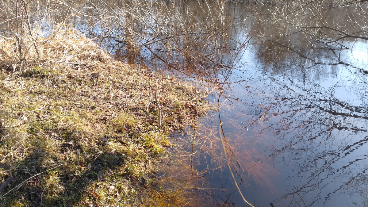 В ручье тоже спадает вода, на Большую Землю уже можно пройти в обычных резиновых сапогах.