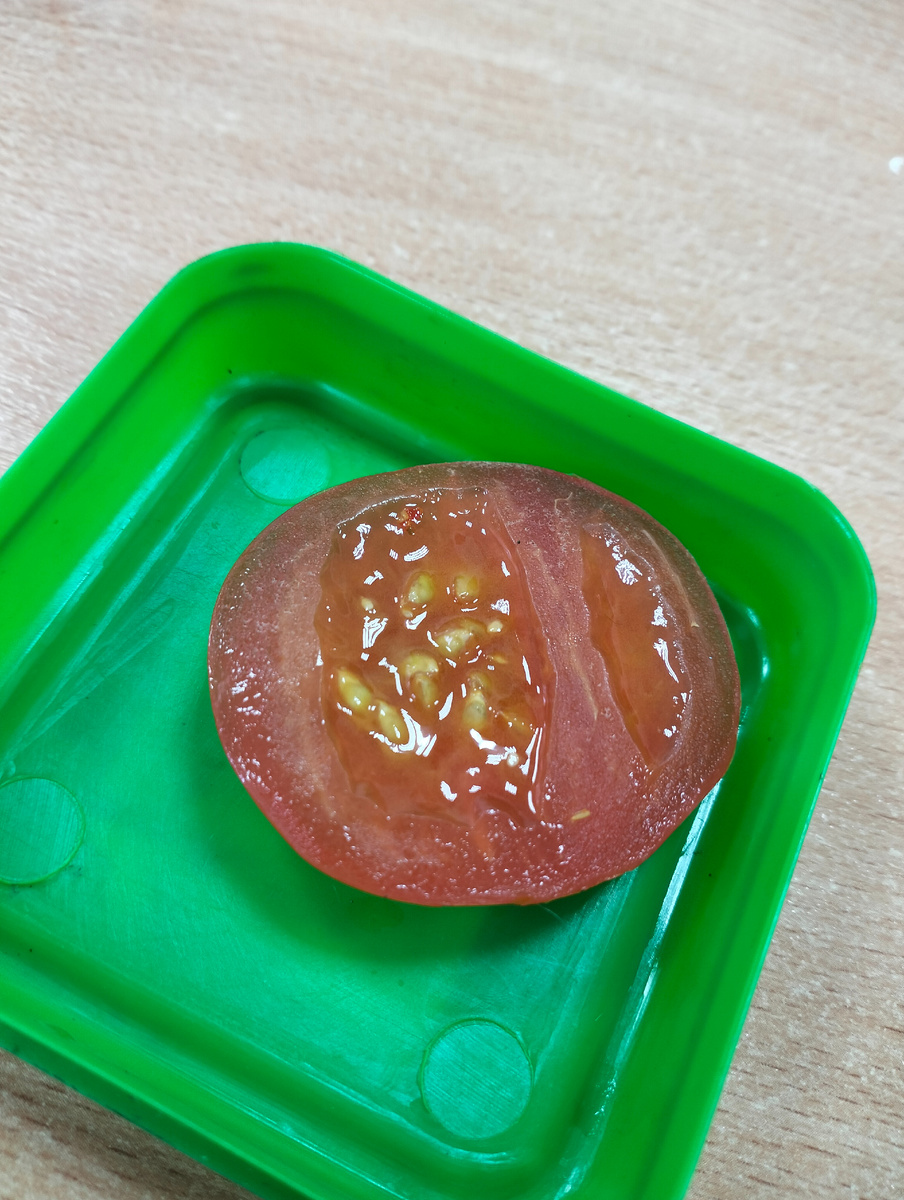 Цель работы: Рассмотреть под микроскопом строение кожуры, мякоти и клеток помидора, выделить их особенности. Оборудование и материалы: Микроскоп Стекла предметное и покровное Острая бритва или скальпель Пипетка Чистая вода Помидор Ход работы: 1. Подготовка срезов: Острым скальпелем сделайте очень тонкий срез кожуры помидора (почти прозрачный). Отрежьте тонкий слой твердой мякоти (ближе к кожуре). Возьмите тонкий слой жидкой мякоти (изнутри, где семена). 2. Приготовление препаратов: Положите тонкий срез кожуры на предметное стекло, добавьте каплю воды пипеткой, накройте покровным стеклом. Аналогично подготовьте препарат твердой мякоти. Для жидкой мякоти: поместите каплю на стекло, равномерно распределите, накройте покровным стеклом. 3. Изучение под микроскопом: Рассмотрите каждый препарат под разными увеличениями. Кожура: обратите внимание на плотные клетки и возможный слой кутикулы. Твердая мякоть: изучите расположение клеток и их форму. Жидкая мякоть: