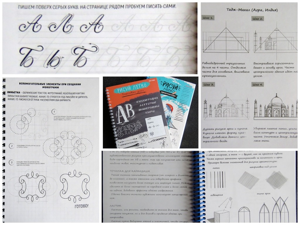 Заинтересовавшись зентанглом и освоив первый онлайн-курс, стала искать, есть ли что-нибудь в продаже, чтобы не нырять в сеть каждый раз. Конечно, есть у меня уже и свой справочный блокнотик, но всё-таки купила две своеобразные прописи из серии "Рисуй легко". Серия предлагает обучающие материалы, сгруппированные по самым разным темам. Это и анималистика, и ботаника, и простейшие рисунки для детей. Все они созданы по одному принципу: справочная информация + альбом для практической работы. Это синтез скетчбука с листами для свободного рисования и обучащих страниц, которые содержат схемы и пунктиры для обводки. Я купила такие обучащие скетчбуки по каллиграфии и леттерингу (перекликается с зентанглом) и по изображению архитектуры. Рассудила, что начальные сведения о перспективе и примеры изображения зданий различной конструкции лишними не будут. Твёрдый переплёт. Крепление листов на спирали. Бумага не слишком плотная и гладкая. То есть использовать , например, спиртовые маркеры или кр