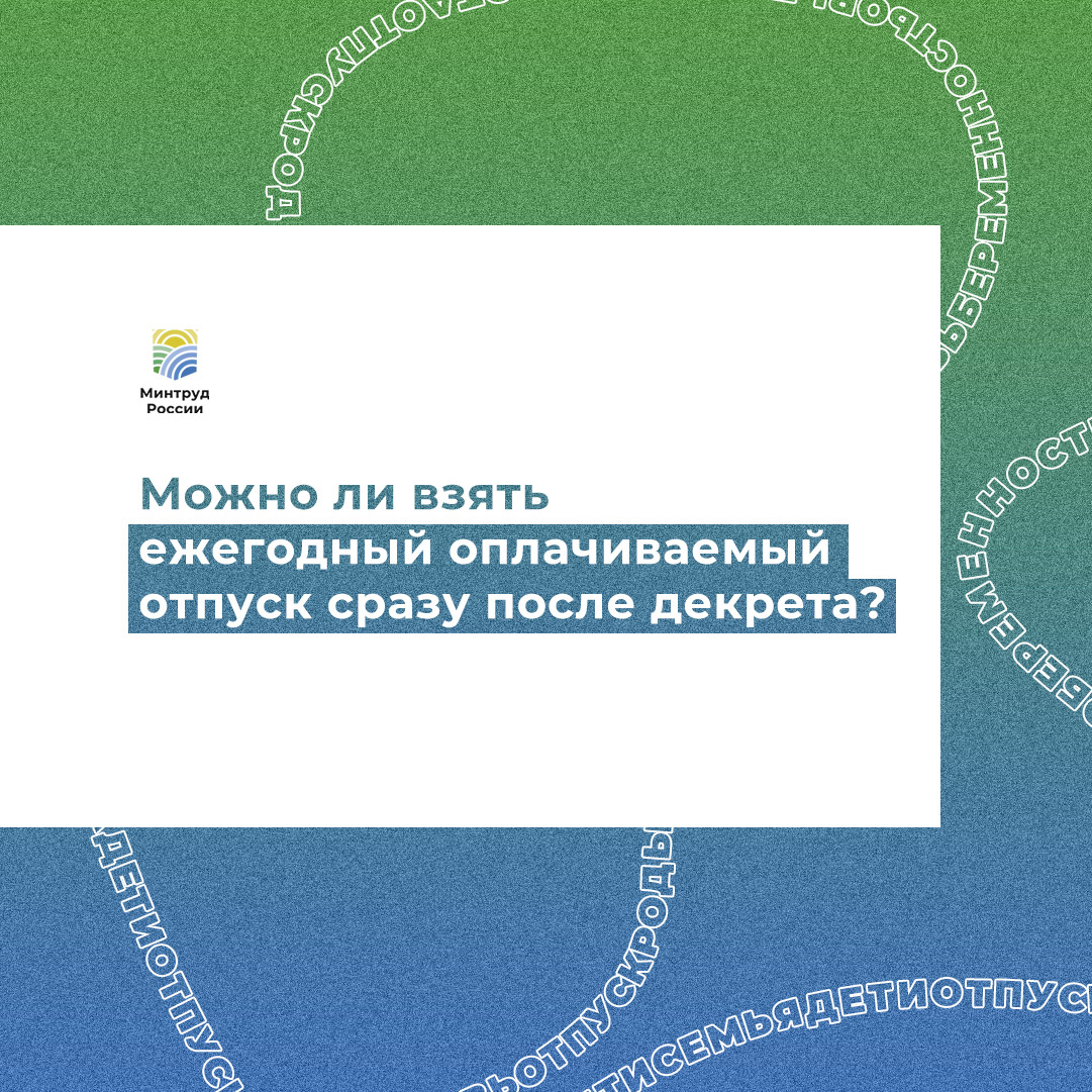 ☑️ Да, конечно. Рассмотрим 3 ситуации: 🟨После завершения отпуска по уходу за ребенком вы можете сразу уйти в ежегодный оплачиваемый отпуск и только после этого вернуться на работу. 🟨После отпуска по беременности и родам вы можете уйти в ежегодный оплачиваемый отпуск, а затем оформить отпуск по уходу за ребенком. 🟨Вы можете уйти в ежегодный оплачиваемый отпуск после отпуска по беременности и родам, а затем выйти на работу. Например, если в отпуск по уходу за ребенком уходит бабушка или папа. ❗️Во всех случаях вы можете использовать все дни ежегодного оплачиваемого отпуска независимо от графика отпусков в вашей организации и стажа работы у данного работодателя.