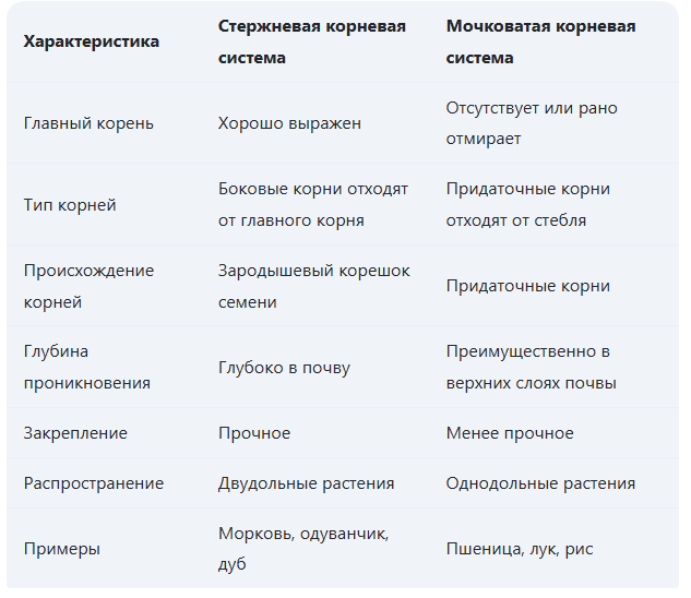 Сравнение стержневой и мочковатой корневых систем (таблица):
