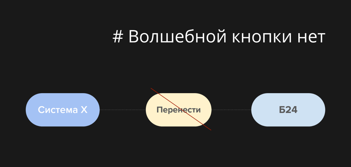 Для начала важно понять, что при переходе из одной системы в другую не существует “волшебной кнопки”, которая выполнит перенос данных. Даже готовые приложения по миграциям не покрывают всех нюансов при переносе данных и не переносят бизнес-процессы. Давай разберемся почему невозможно “переехать” так быстро и легко.