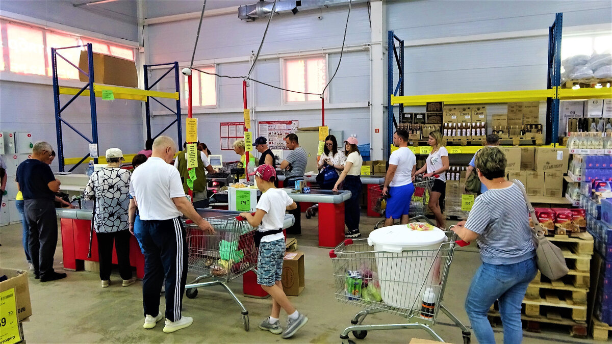 Покупатели на кассу везут полные тележки разнообразного товара.